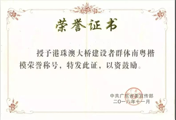 11月3日,廣東省委宣傳部授予港珠澳大橋建設者群體 “南粵楷模”稱號。廣東省委常委、宣傳部部長傅華出席活動,并會見了港珠澳大橋建設者代表。
